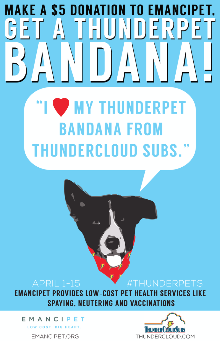 When you make a $5 donation to Emancipet at any ThunderCloud Subs store April 1-15, you’ll get an awesome pet bandana for your dog or cat to wear around town. Emancipet is an Austin-based nonprofit on a mission to make high-quality spay/neuter and veterinary care affordable and accessible to all pet owners.